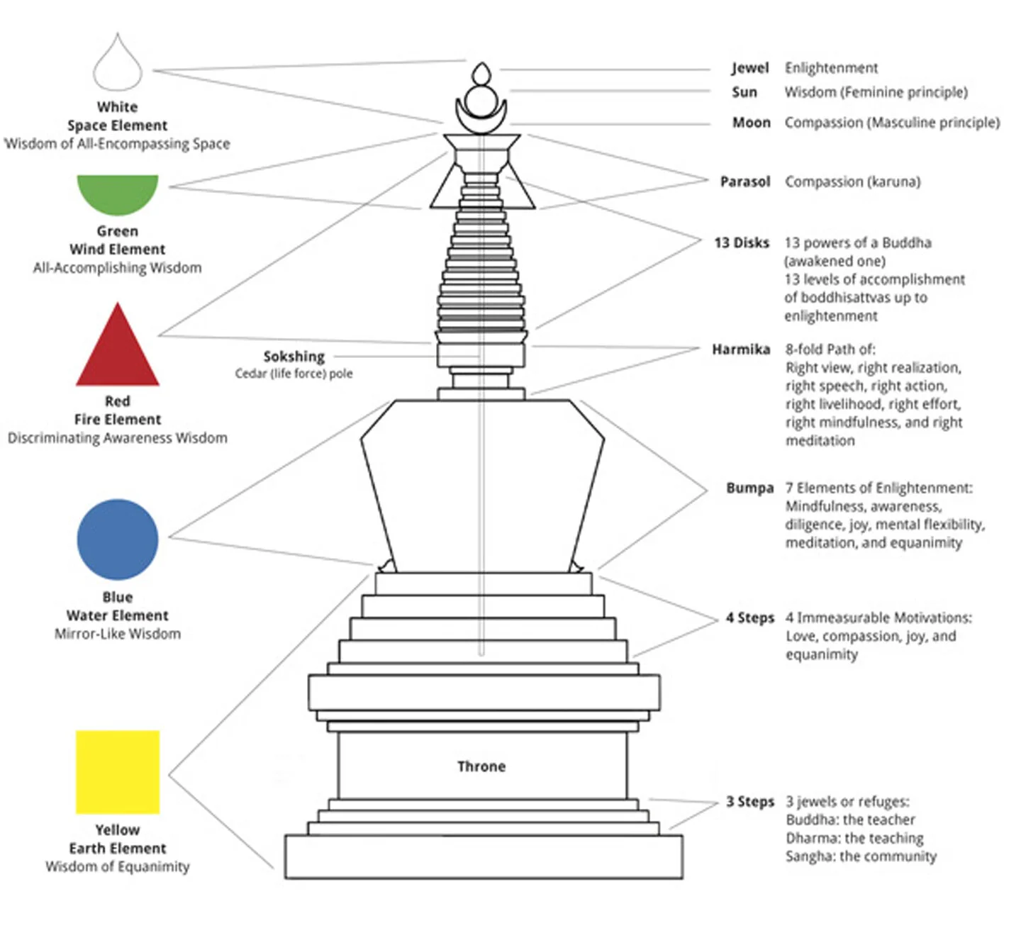 The Buddhist stupa is a symbolic representation of the Buddha’s body, from his crossed legs on his throne, up to his head and beyond. Stupas also correspond with the five archetypal elements— the yellow square earth element represents the base, the blue circle water element represents the bumpa, or mid-section, the red triangle fire element represents the spire, the green half circle wind element corresponds with the parasol, and the white tear shape space element represents the moon and sun and top jewel, representing enlightenment.